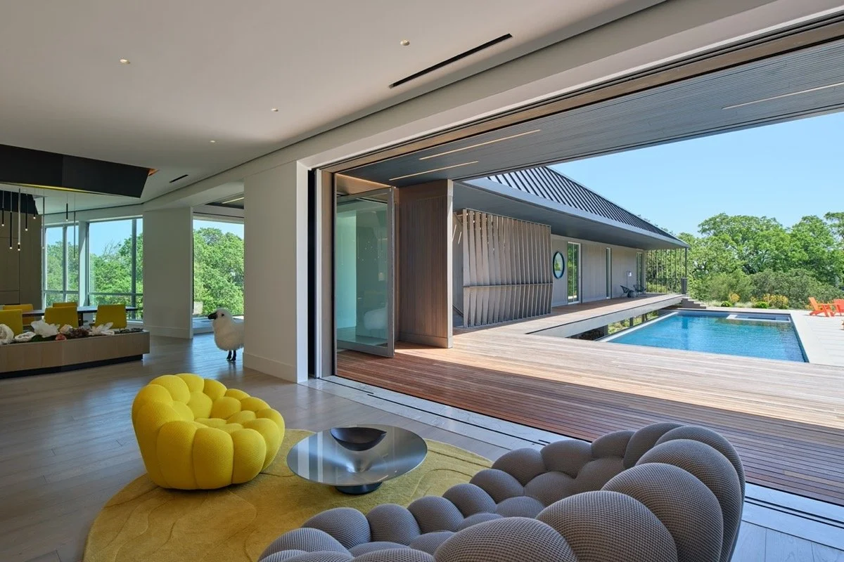 A defining element of the project is the pool, designed by Schwartz^Architecture and cantilevered beneath the home. The pool and surrounding stone forms echo material expressions found within the residence, allowing architectural and landscape elements to read as part of a unified composition. Integrated with adjacent terraces and gardens, the pool transforms an otherwise underutilized area into a dramatic and functional outdoor feature that anchors the landscape.